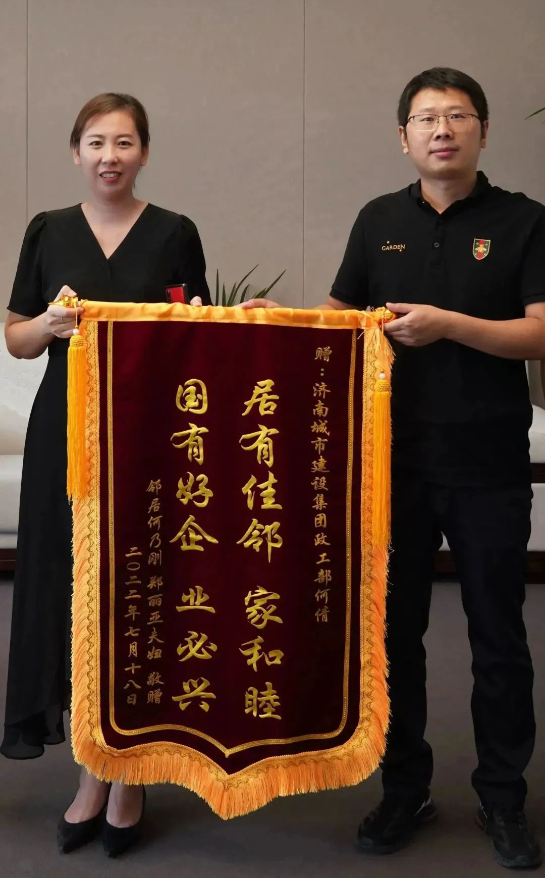 一面“居有佳邻家和睦 国有好企业必兴”的锦旗送至PA集团官网,这是济南市民何先生对何倩给予其妻子的及时帮助所表示的诚挚感谢。