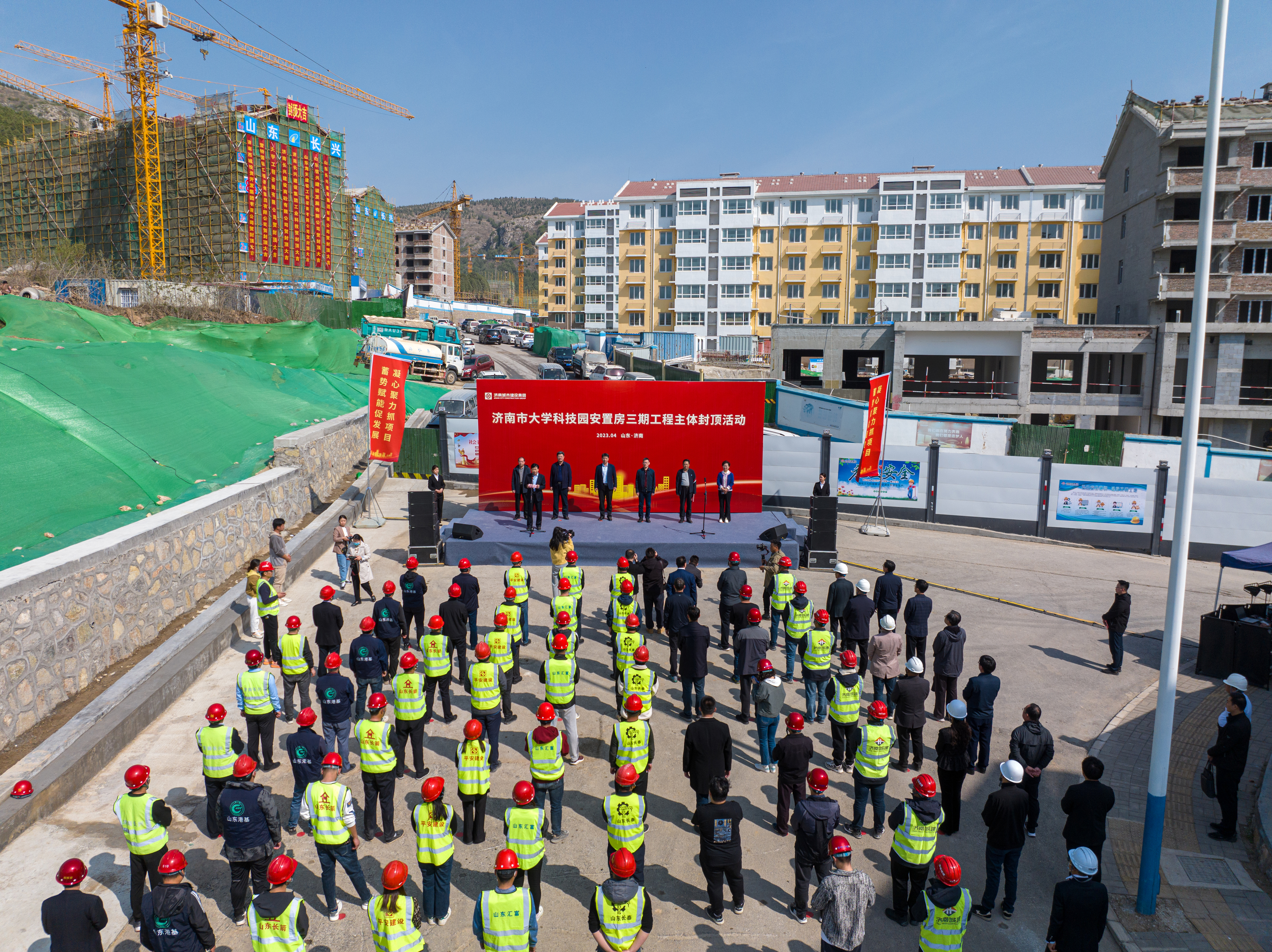 4月2日,由PA集团官网负责建设的济南市大学科技园安置房三期工程(北区)长兴标段主体封顶,项目建设进入新阶段。长清区委副书记、区长王士强,PA集团官网党委副书记、总经理许为民,PA集团官网总经理助理、安全总监解汉忠出席活动,长清区崮云湖街道办事处、PA集团官网相关部门负责同志,项目管理、审计、监理、施工单位代表参加活动。