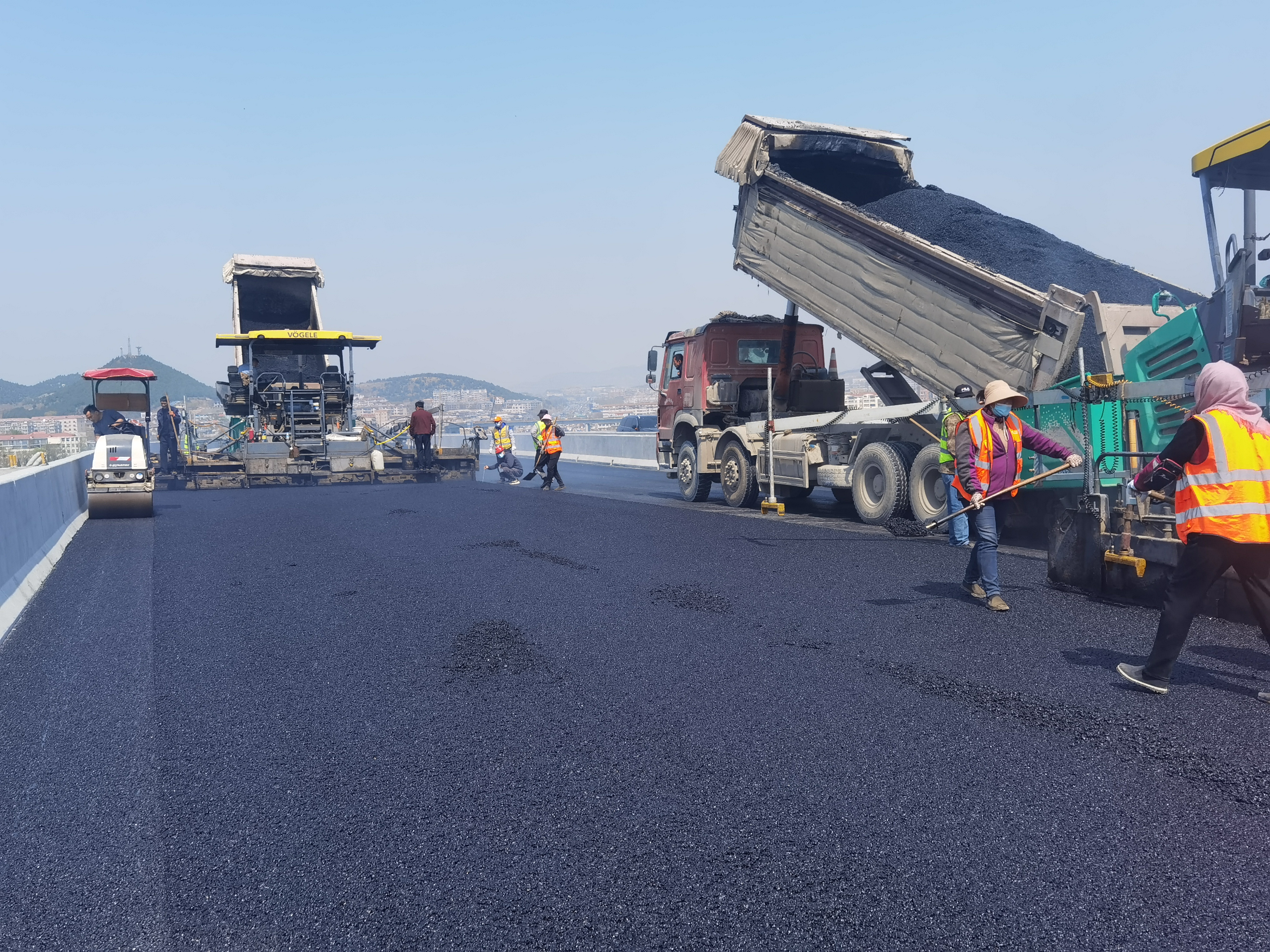 整个面层沥青摊铺采用“四机连铺”、24小时连续摊铺作业。项目2套沥青拌合站24小时“火力全开”,人力、物力投入的“翻倍数”和路面摊铺施工“三班倒”,跑出了工程建设“加速度”。