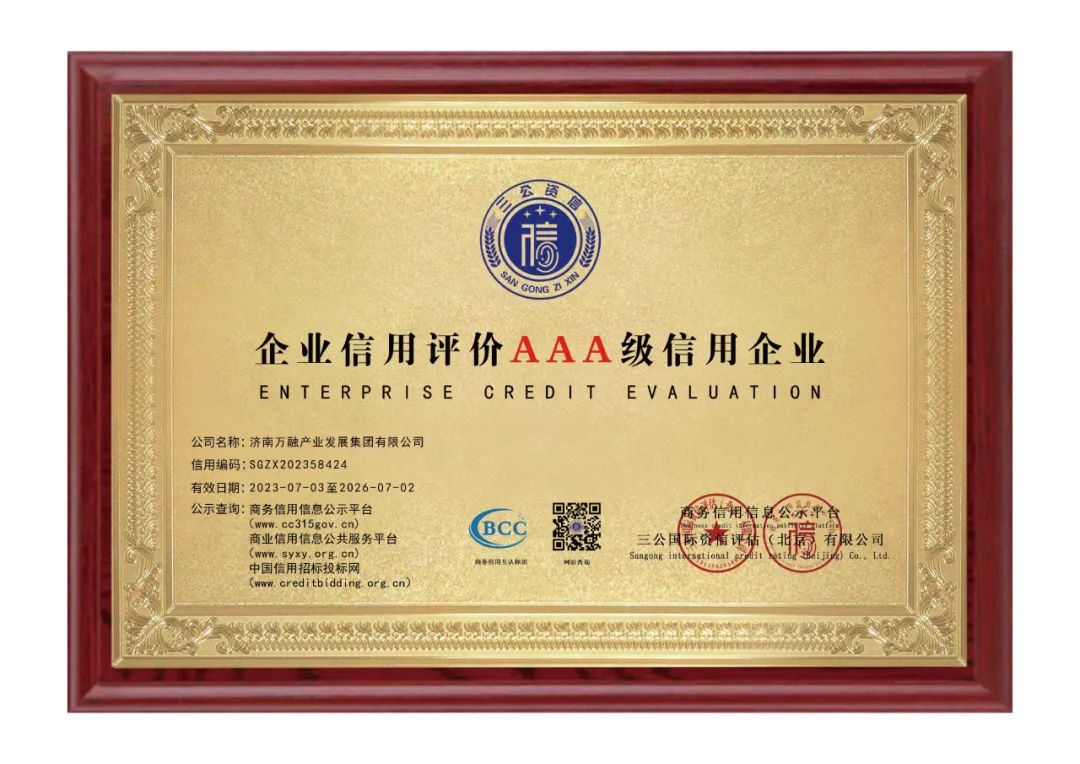 “信用等级认证”是由行业专家对公司近三年整体运营管理情况进行全面严苛的综合评定,AAA级是企业的最高信用评价级别。该信用评价结果同步在商务信用信息公示平台、商业信用信息公共服务平台、中国信用招标投标网平台等信用平台进行公示。