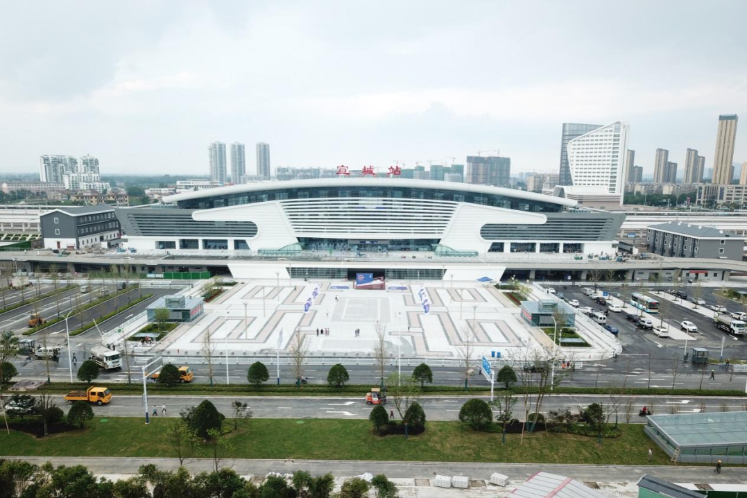 宣城火车站东西广场一体化项目总建筑面积25998平方米,其中地上532平方米,地下25466平方米,除了普通绿化、地面道路外,宣城站还配备了地面公交车站、出租车站以及人行景观广场,目前成为宣城地标性建筑。