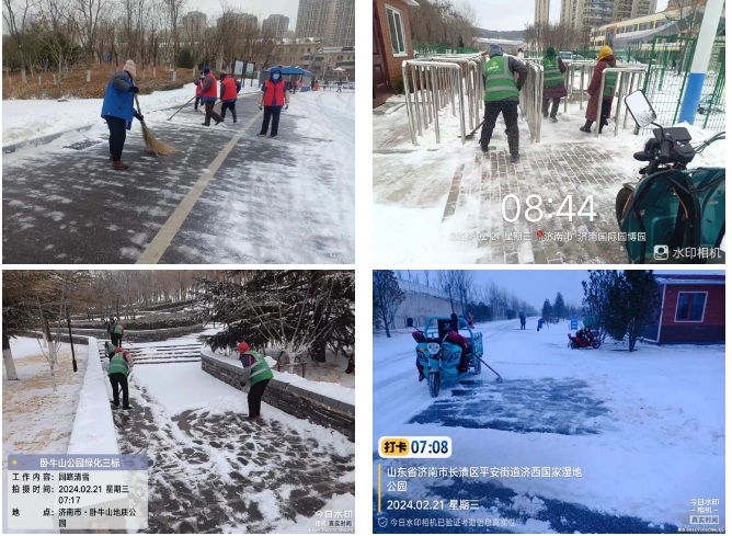 PA集团官网园区管理有限公司提前做出预判并发布相应通知,为恶劣天气应急管理做好全面准备。华山、济西湿地、济南园博园三大景区及时响应、迅速行动,全力组织开展扫雪除冰工作,利用扫雪车、雪锹、雪铲等工具,对景区内各出入口、广场、道路台阶等重点部位进行清雪、清冰工作并铺设相应防滑措施,保障道路畅通与市民游客安全,最大限度减少低温雨雪天气影响。