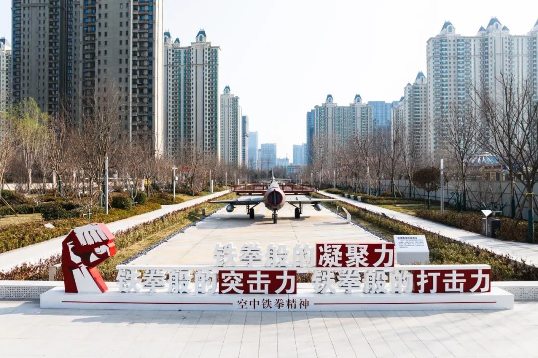 在公园南地块纪念广场,通过展示张庄机场原驻扎部队6位空军战斗英雄的雕像和英雄事迹,以及“空中铁拳精神”展示,传承红色基因。