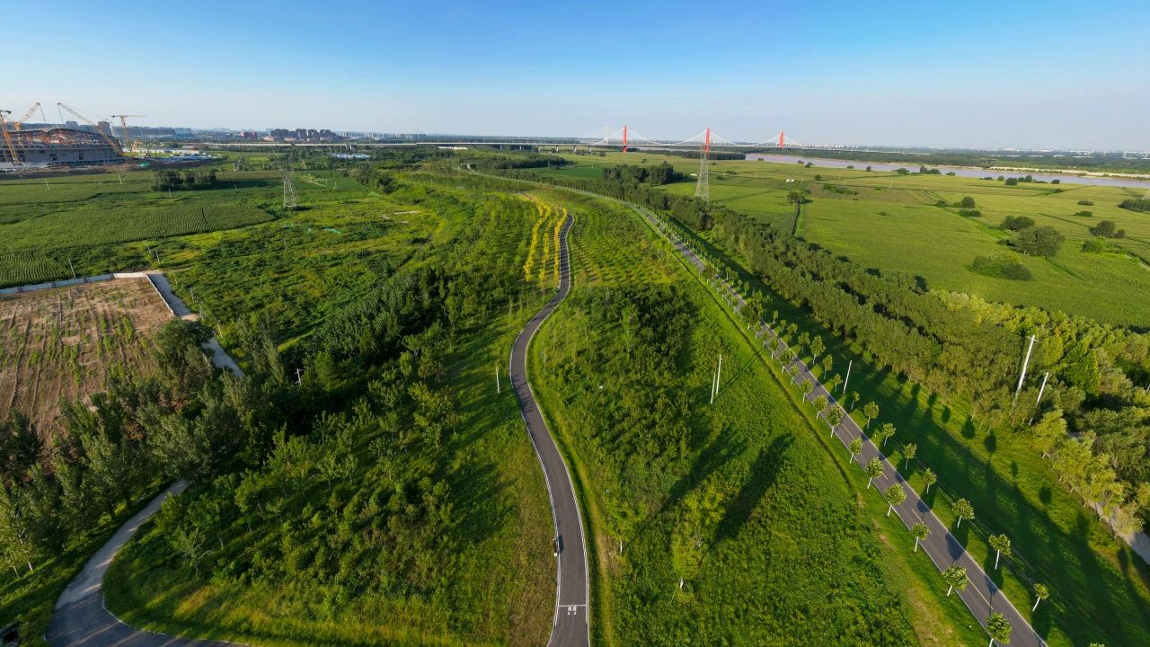 项目位于石济黄河公铁两用桥至济南黄河凤凰大桥段黄河北岸淤背区内,实施范围为堤顶路北侧的水工建设用地,南北向约100m。项目西邻崔寨片区,东临堤顶路,与崔寨片区规划路和滩区道路联系紧密;北邻黄河体育中心,为黄河沿岸重要的城市节点和起步区区域地标。项目施工总面积368695m²,主要建设内容为绿化苗木栽植,园路施工,景观照明,公厕管理房,附属设施等。