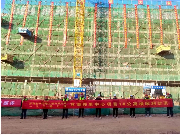 邻里中心项目是临沂市观摩项目,涉及钢结构、钢筋混凝土结构、幕墙工程、装饰装修、安装工程、电梯工程、ALC墙板工程等多个专业性较强的领域,工期紧、任务重,给项目团队带来了很大的挑战。项目部周密策划组织施工,积极落实质量安全交底,统筹调配人材机配置与进场,铆足干劲、团结协作,每天召开例会各个击破现场问题,不断提高施工效率、质量。12月15日,项目公寓楼顺利封顶,标志着项目建设取得阶段性胜利。