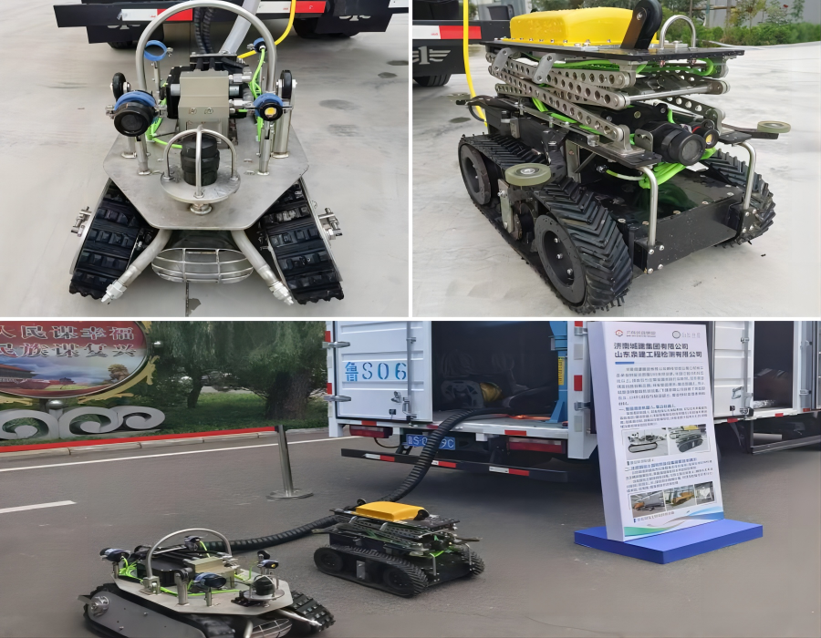 城建集团公司创新研发的管道清淤机器人、管道雷达检测机器人两款智能建造高新装备均达到IP68等级,可在管道满水情况下作业。其中,管道清淤机器人对管道内淤堵采用声呐定位,前端搭载高压喷头及吸污口,实现DN800及以上管径管道的快速高效清淤;管道雷达检测机器人搭载高性能防水雷达天线,并设有升降装置,可根据不同管径,灵活调整雷达高度,实现DN800及以上管径管道内表面及壁后缺陷的精准检测。