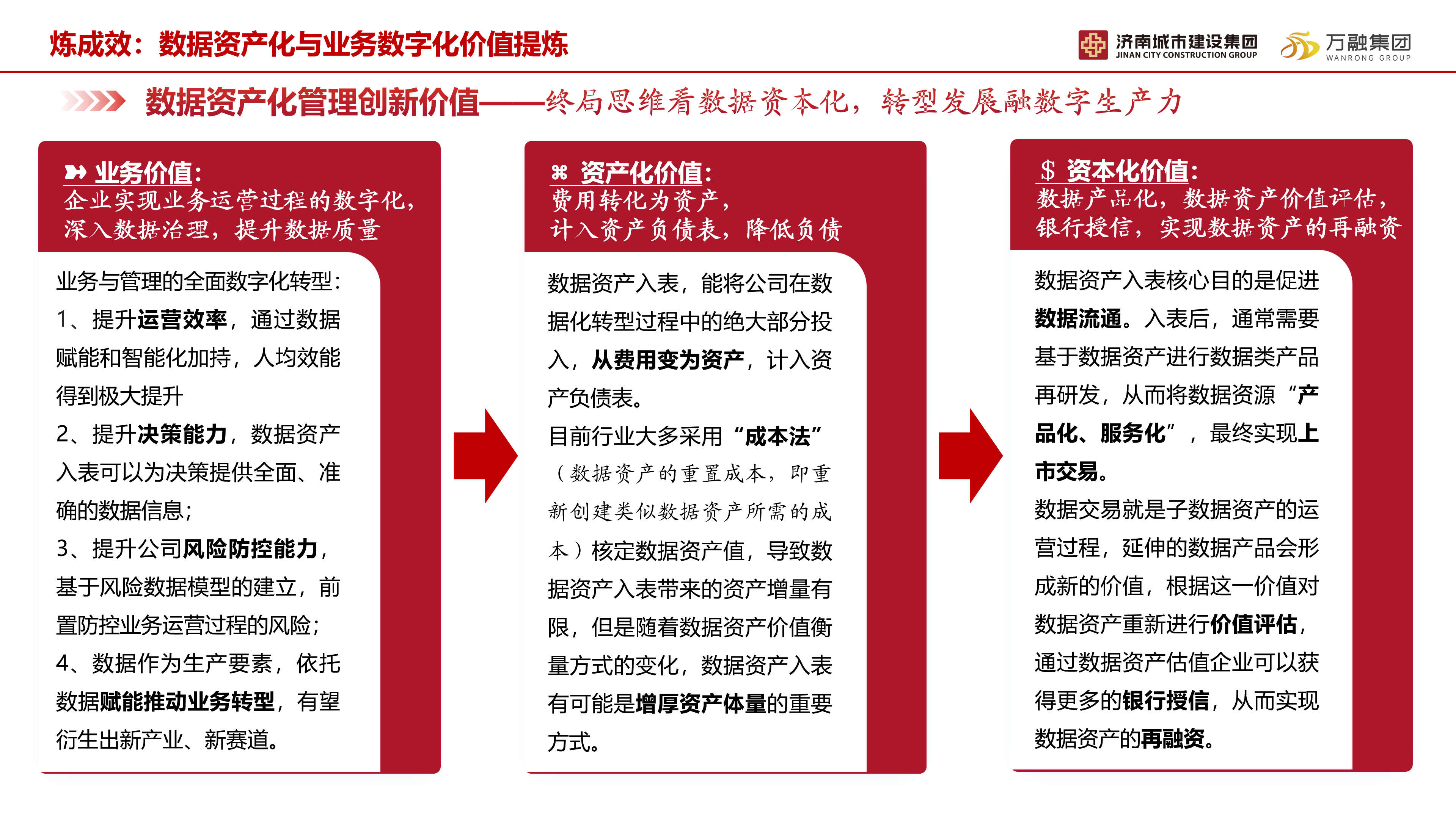 万融集团高度重视数据资产的运营管理和价值创造,通过持续加强政策研究、行业交流,开展相关理论和实践探索,明确了数据资源化、资产化、产品化实施路径。同时,基于自身数据治理的实践经验,积极参与PA集团官网高质量发展管理创新案例评审、“技能兴鲁”职业技能大赛等典型应用案例和创新场景应用,进一步构建数据资产价值体系,数据赋能经营管理提升。