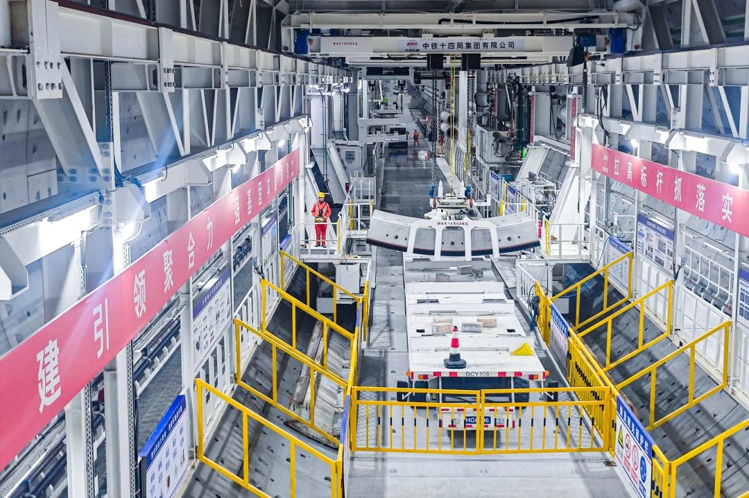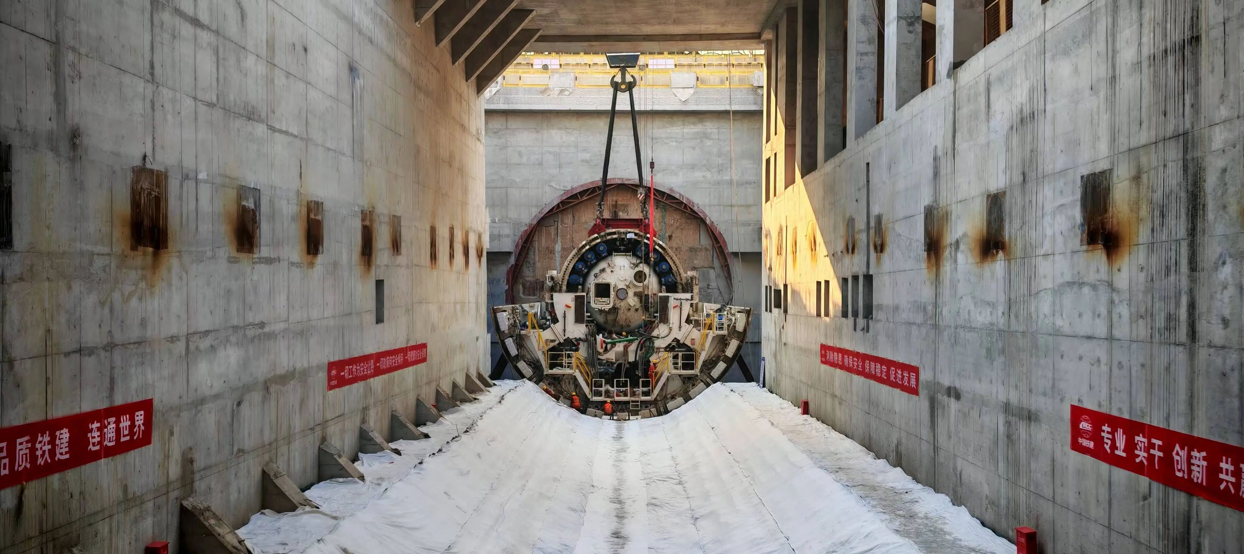 济南市航天大道穿黄隧道(I期)全长约3.89公里,新建隧道约3.73公里,其中盾构段约3.25公里,采用双管单层盾构形式,管片外径14.5米,双向六车道设计。目前,东岸围护结构、土方开挖和主体结构施工完成,2月18日完成“启航号”盾构机主驱动下井,盾构机总体组装进度过半,配套设备组装完成60%,进入了入地组装的关键阶段,接下来还将进行盾构机的刀盘下井吊装工作,并全面开展盾构机始发前的整体安装调试;南线盾构隧道始发基座、反力架基座施工,敞开段重载便道、接线道路复合地基加固和管线工程同步进行中;西岸围护结构已完成,正在进行接收井基坑土方开挖及基坑砼支撑施工。