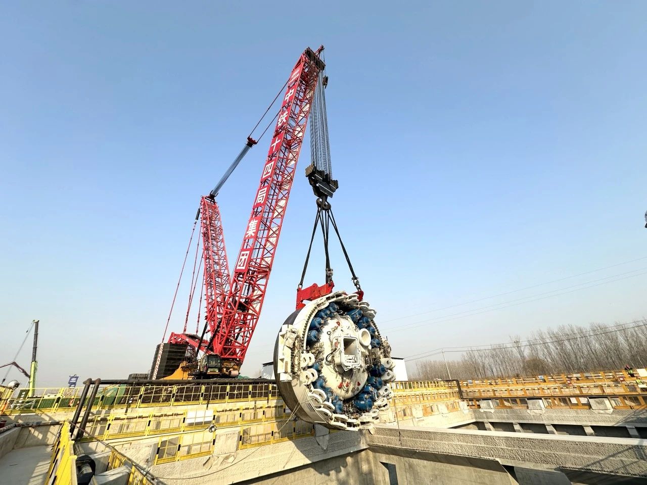 为了确保主驱动顺利下井,项目团队科学部署、超前谋划,多次研究施工现场,详细制定主驱动吊装下井方案,确保周围环境符合施工要求。当天上午,随着指令下达,800吨履带吊将主驱动平稳吊起,在空中经历了起吊、翻身、旋转等一系列高难度动作后,经过现场一点点调整方位后,缓缓送入始发井内,成功与井下盾体结合。