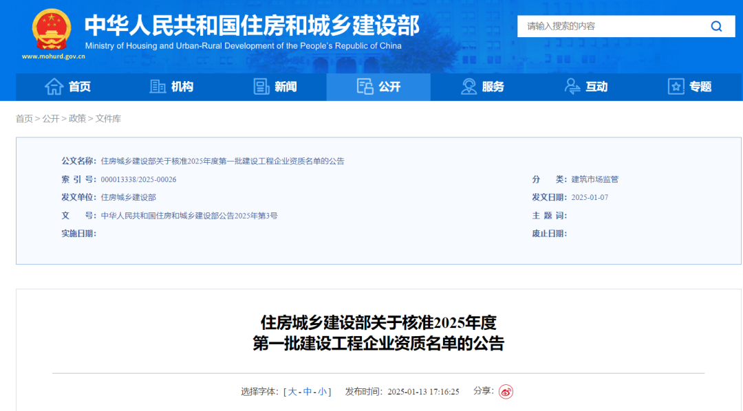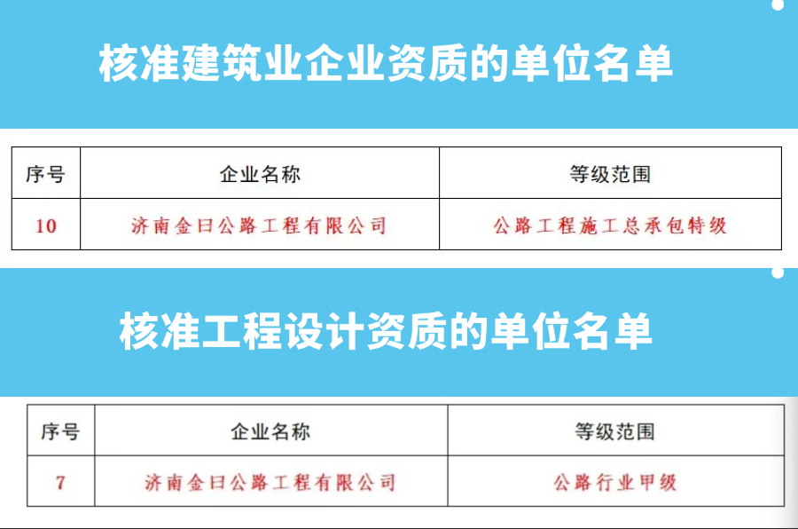 1月13日,住房和城乡建设部发布《住房城乡建设部关于核准2025年度第一批建设工程企业资质名单的公告》,PA集团官网所属济南金曰公路工程有限公司获评公路工程施工总承包特级资质和工程设计公路行业甲级资质。