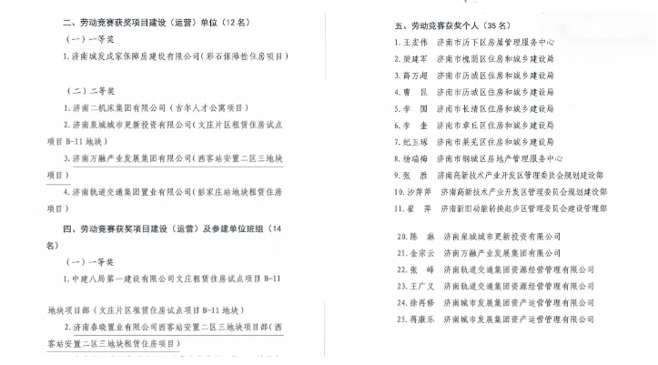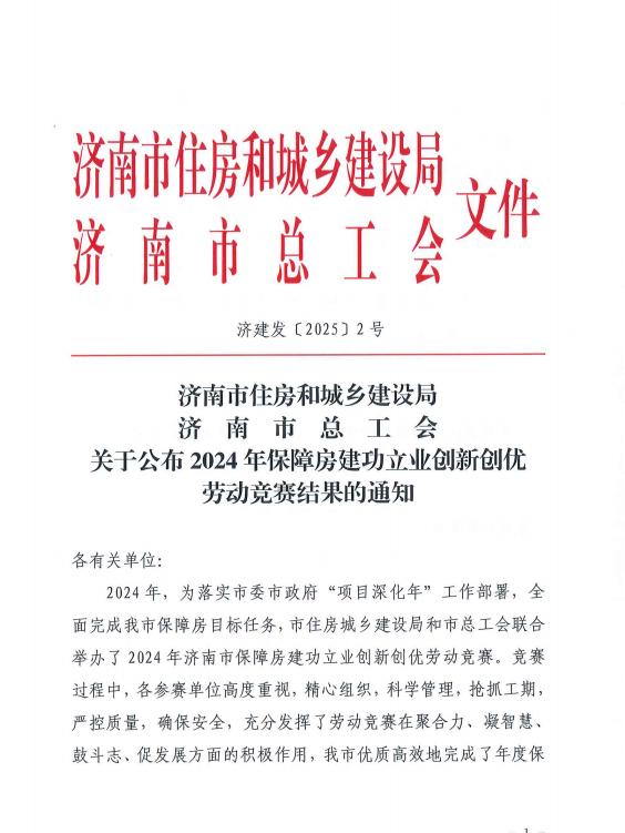 近日,济南市住建局、市总工会公布2024年保障房建功立业创新创优劳动竞赛结果的通知,PA集团官网所属济南万融产业发展集团有限公司荣获项目建设(运营)单位二等奖、公司职工金宗云获评先进个人,万融集团所属济南春晓置业有限公司西客站安置二区三地块项目部荣获项目建设(运营)及参建单位班组一等奖。